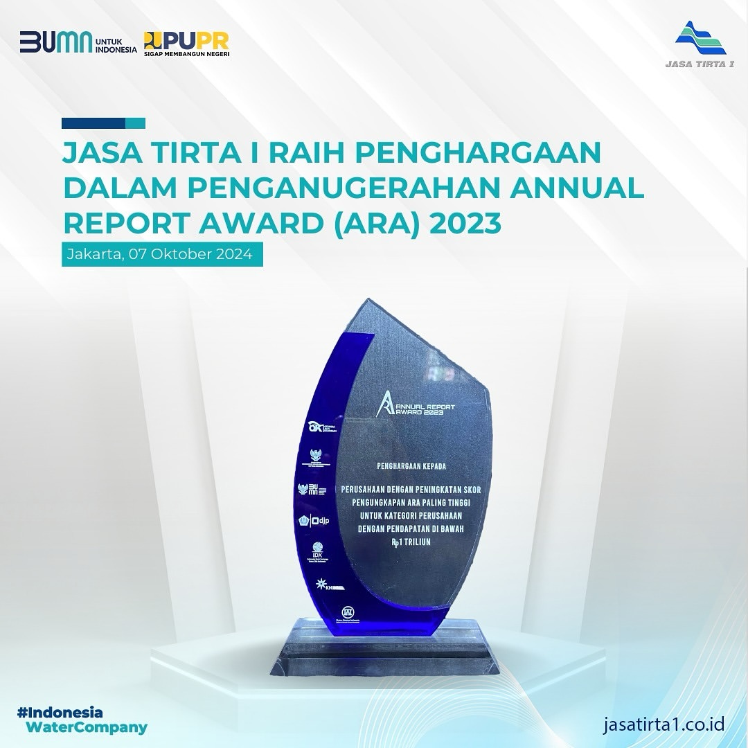 Perum Jasa Tirta I (PJT I) baru saja meraih penghargaan bergengsi dalam acara Annual Report Award (ARA) 2023. Acara ini diselenggarakan oleh Komite Nasional Kebijakan Governansi (KNKG) pada hari Selasa, 07 Oktober 2024, di Main Hall Gedung Bursa Efek Indonesia yang berada di Jakarta.