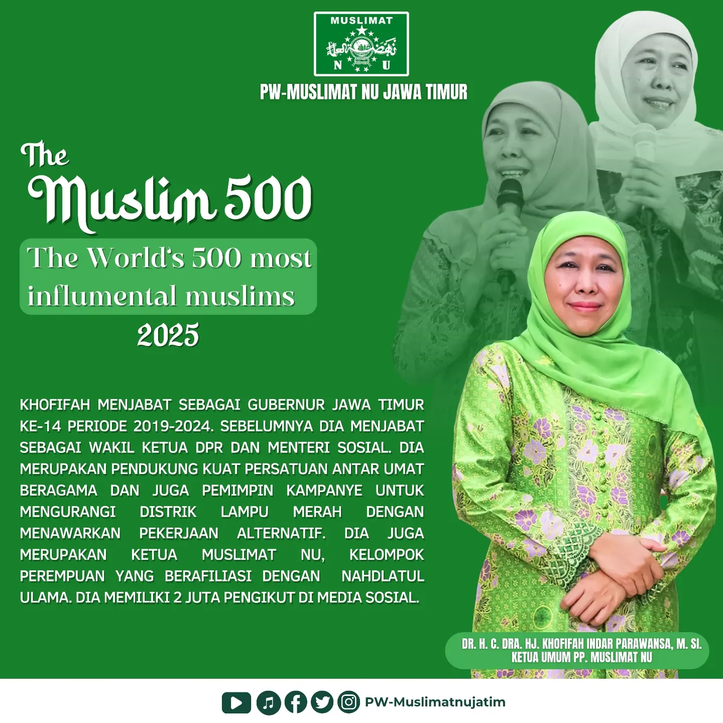 Ibu Dr. H. C. Dra. Hj. Khofifah Indar Parawansa, M. Si., Ketua Umum Pengurus Pusat Muslimat Nahdlatul Ulama (PP. Muslimat NU), baru-baru ini mendapatkan pengakuan internasional. Beliau terpilih sebagai salah satu dari 500 tokoh Muslim paling berpengaruh di dunia.