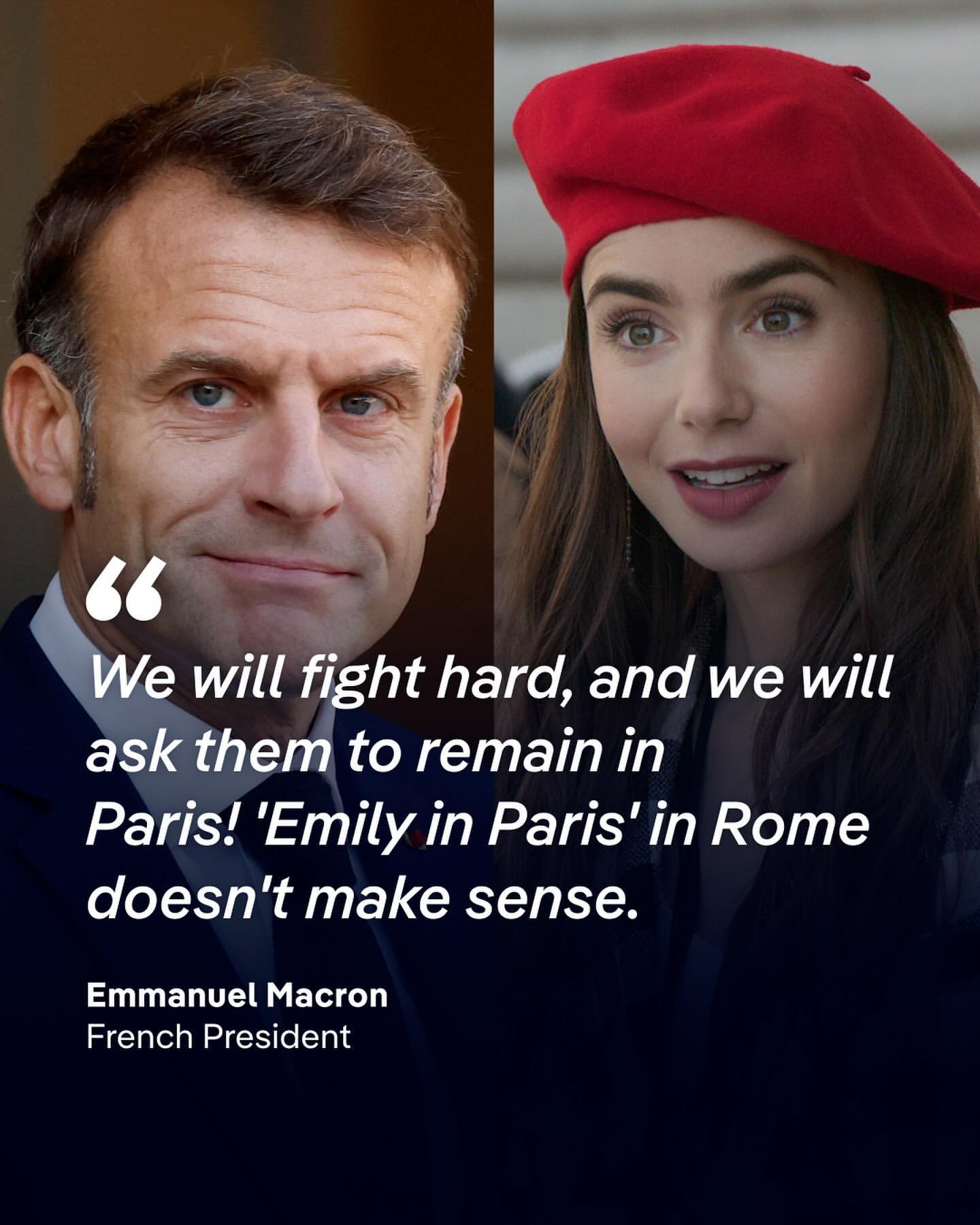 Macron menegaskan, "Emily in Paris di Roma tidak masuk akal," dan menambahkan, "kami akan meminta Anda untuk tetap di Paris!" Ia juga menyebutkan bahwa serial ini sangat menarik untuk citra negara, di mana istrinya, Brigitte, muncul dalam penampilan cameo di musim terbaru.