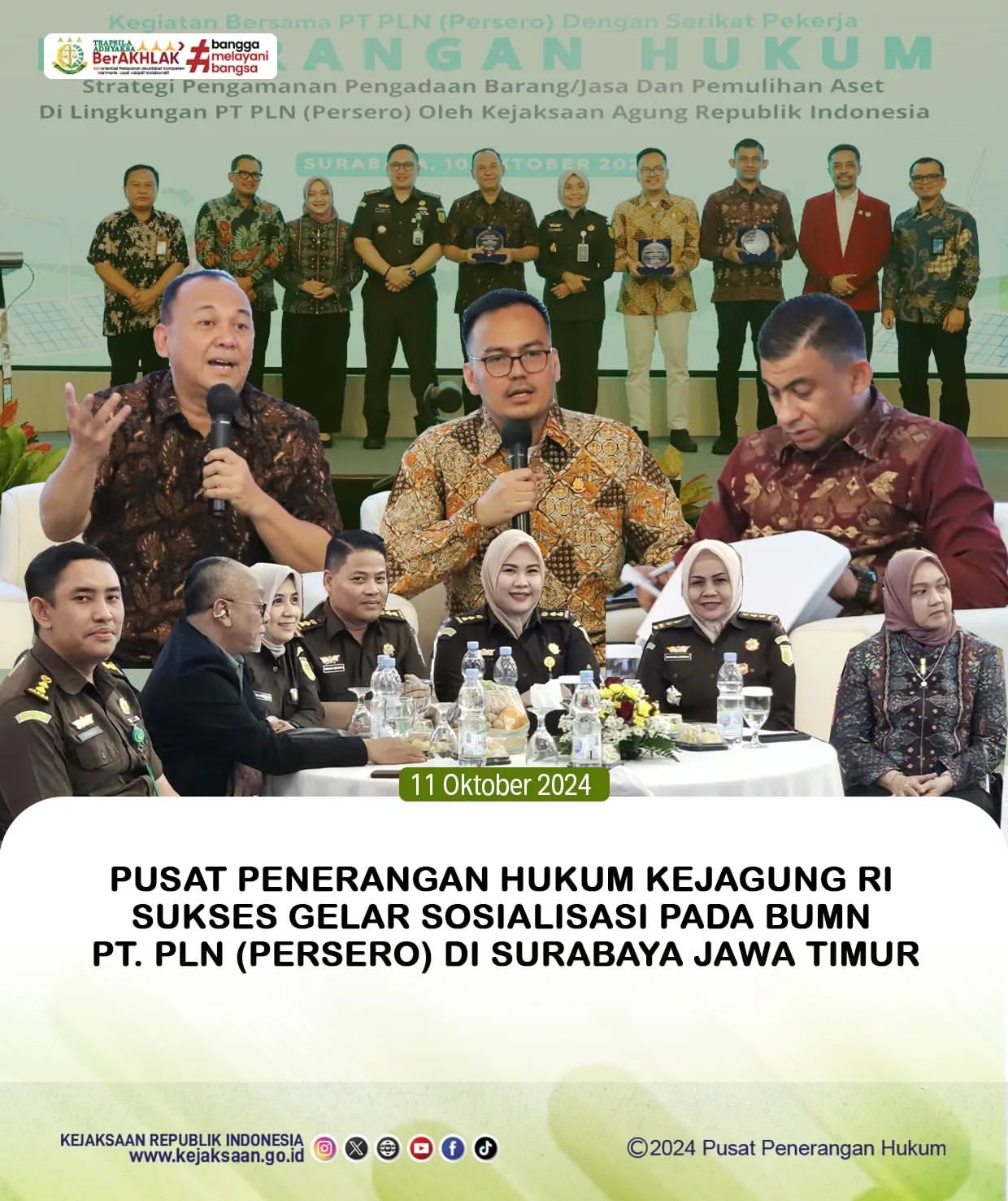 Pusat Penerangan Hukum Kejaksaan Agung Republik Indonesia berhasil menyelenggarakan acara sosialisasi hukum di Surabaya pada tanggal 10 Oktober 2024. Acara ini diadakan di PT. PLN (Persero) dan dihadiri oleh lebih dari 100 peserta dengan tema "Strategi Pengelolaan dan Pemulihan Aset serta Pengamanan Pengadaan Barang dan Jasa pada BUMN".