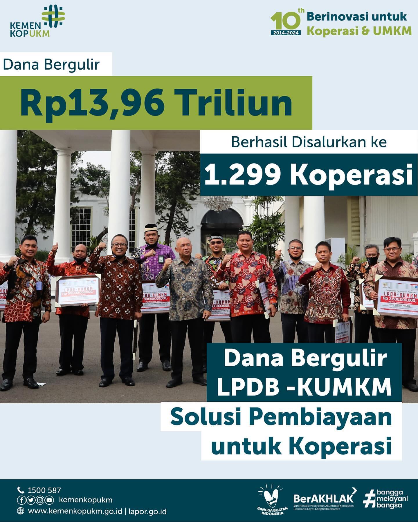 Kementerian Koperasi dan Usaha Kecil Menengah (UKM) melalui Lembaga Penyaluran Dana Bergulir Koperasi dan UMKM (LPDB - KUMKM) telah berhasil menyalurkan dana bergulir sebesar Rp13,96 triliun hingga tahun 2024. Dana ini telah disalurkan kepada 1.299 mitra koperasi, yang mencakup total penerima mencapai 492.705 pelaku usaha.
