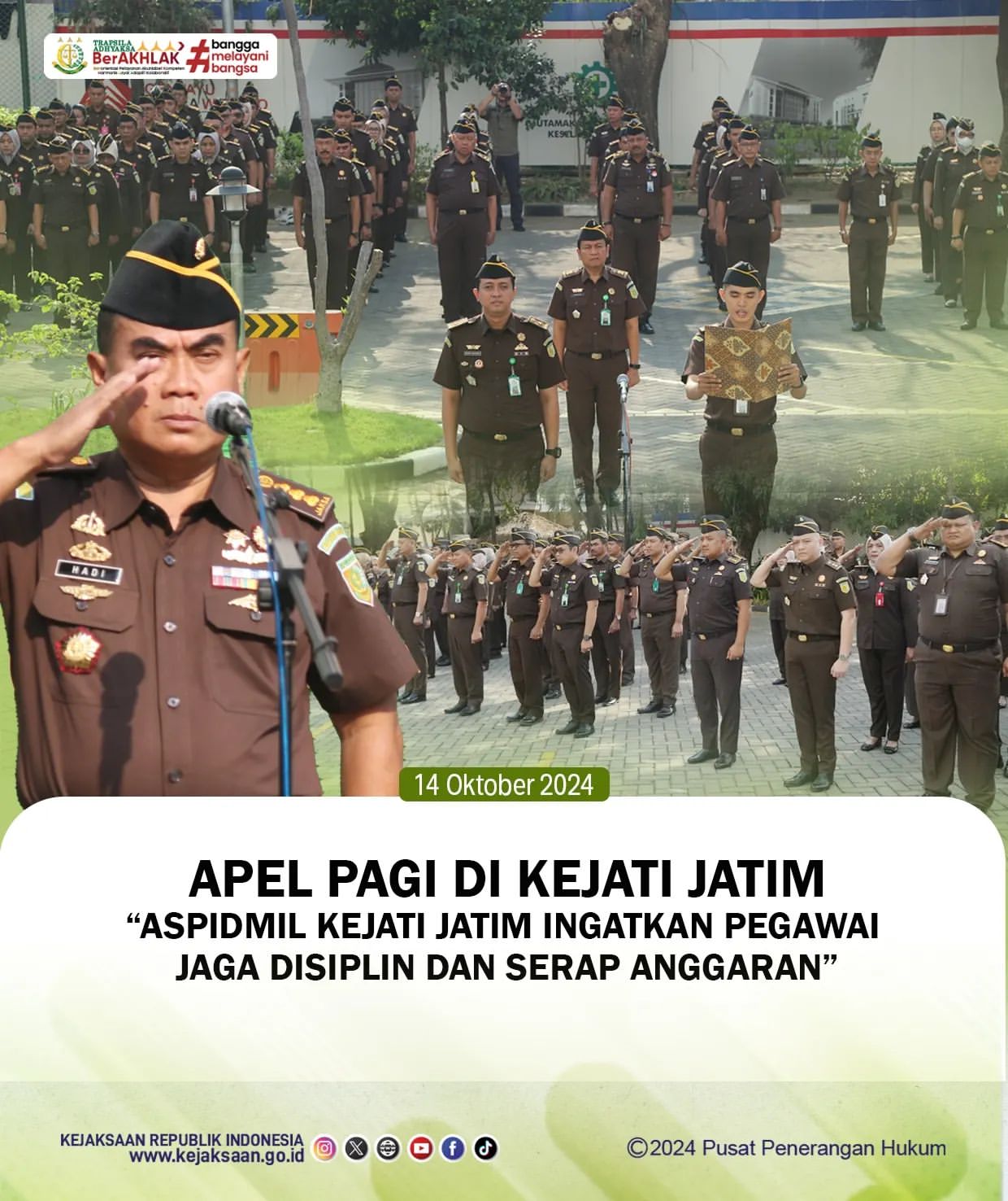 Surabaya - Pada hari Senin, 14 Oktober 2024, Kejaksaan Tinggi Jawa Timur (Kejati Jatim) mengadakan apel pagi yang dipimpin oleh Asisten Pidana Militer (Aspidmil) Kejati Jatim, Hadi Pangestu, SH., MM., MH. Apel ini juga dihadiri oleh seluruh pegawai Kejati Jatim dan dipimpin oleh Kasi Uheksi, Djonni Samsuri, SH., MH.