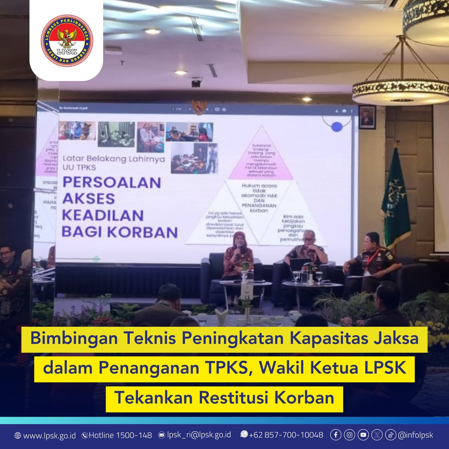 Pontianak, Kalimantan Barat - Wakil Ketua Lembaga Perlindungan Saksi dan Korban (LPSK), Sri Nurherwati, menjadi narasumber dalam acara Bimbingan Teknis Peningkatan Kapasitas Jaksa dalam Penanganan Perkara Tindak Pidana Kekerasan Seksual (TPKS). Acara ini diselenggarakan oleh Jaksa Agung Muda Bidang Tindak Pidana Umum pada 9 hingga 11 Oktober 2024.