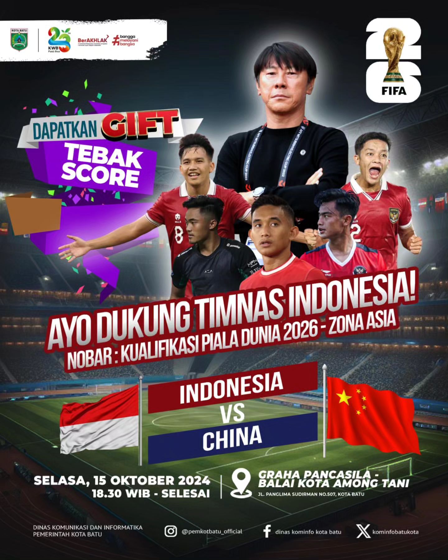 Pemerintah Kota Batu mengundang seluruh masyarakat untuk meramaikan acara nonton bareng (nobar) pertandingan Timnas Indonesia melawan China. Acara ini akan berlangsung pada Selasa, 15 Oktober 2024, di Graha Pancasila, Balai Kota Among Tani, mulai pukul 18.30 WIB.