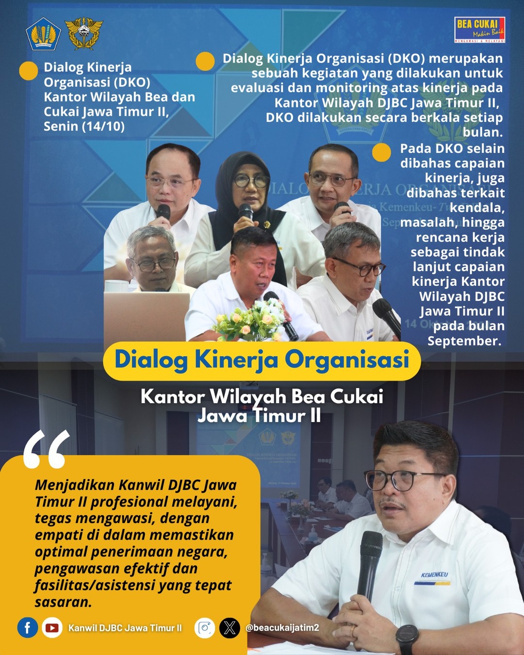 Dalam upaya untuk meningkatkan kualitas pelayanan dan pengawasan, Kantor Wilayah Bea dan Cukai Jawa Timur II mengadakan Dialog Kinerja Organisasi (DKO) pada hari Senin, 14 Oktober 2024. Kegiatan ini merupakan bagian dari evaluasi dan monitoring yang dilakukan secara berkala setiap bulan.
