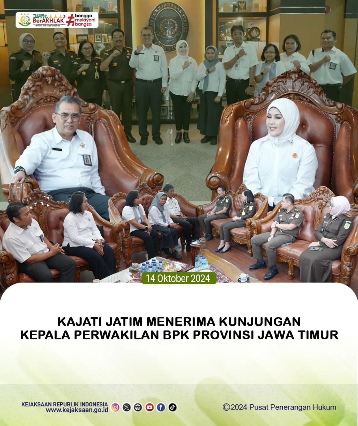 Pada hari Senin, 14 Oktober 2024, Kepala Kejaksaan Tinggi Jawa Timur (Kajati Jatim), Dr. Mia Amiati, S.H., M.H., CMA., CSSL, menerima kunjungan dari Bapak Yuan Candra Djaisin, S.E., M.M., Ak., CPA., CSFA, yang merupakan Kepala Perwakilan Badan Pemeriksa Keuangan (BPK) Provinsi Jawa Timur. Kunjungan ini merupakan bagian dari silaturrahmi dan bertujuan untuk memperkuat koordinasi antara Kajati Jatim dan BPK.