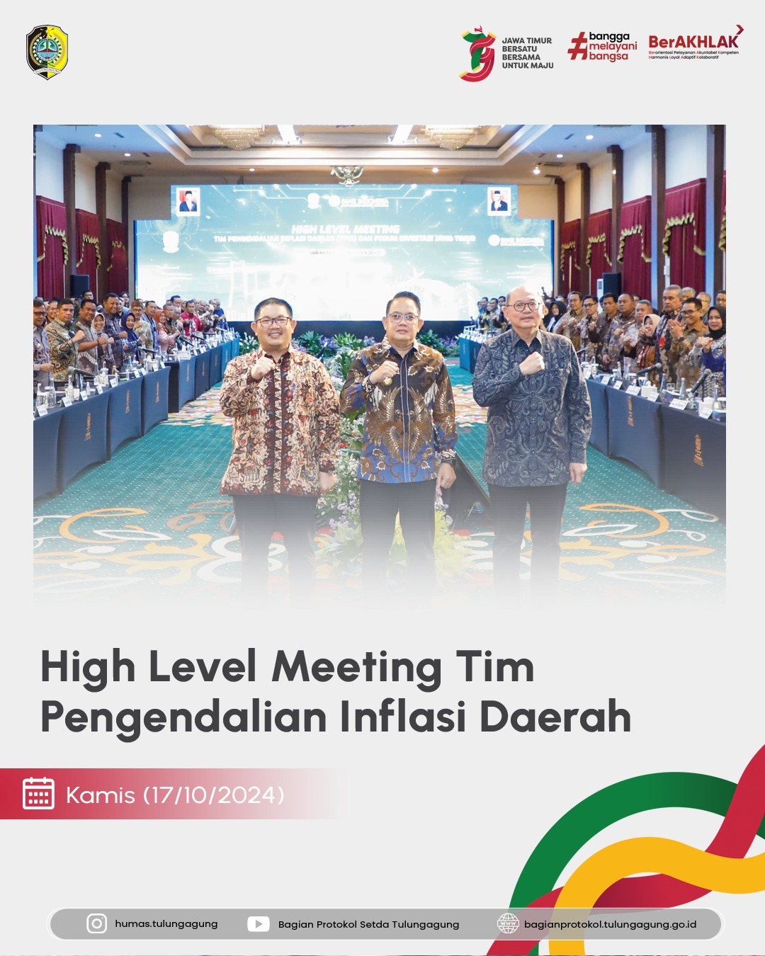 Pada hari Kamis, 17 Oktober 2024, Sekretaris Daerah (Sekda) Kabupaten Tulungagung, Drs. Tri Hariadi, M.Si, mengikuti sebuah acara penting yang disebut High Level Meeting (HLM) Tim Pengendalian Inflasi Daerah (TPID) dan Forum Investasi. Acara ini berlangsung di Gedung Negara Grahadi dan dipimpin oleh Penjabat (Pj) Gubernur Jawa Timur, Adhy Karyono, A.Ks., M.A.P.
