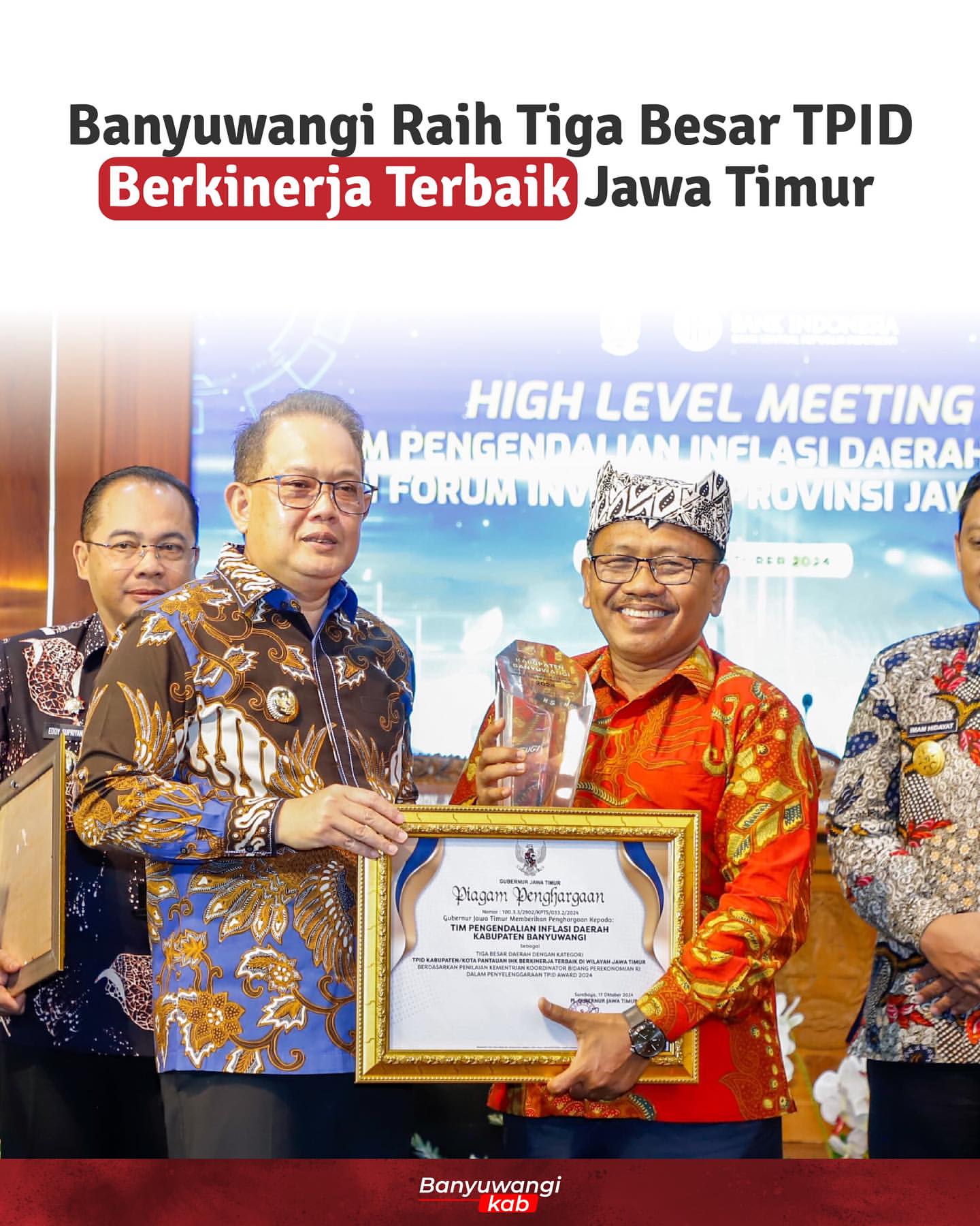 Banyuwangi, Jawa Timur, berhasil meraih prestasi gemilang dengan masuk dalam tiga besar Tim Pengendalian Inflasi Daerah (TPID) terbaik di provinsi tersebut. Penghargaan ini diberikan pada tanggal 17 Oktober 2024, oleh Penjabat Gubernur Jawa Timur, Adhi Karyono, kepada Pelaksana Tugas (Plt) Bupati Banyuwangi, Sugirah, di acara yang berlangsung di Surabaya.