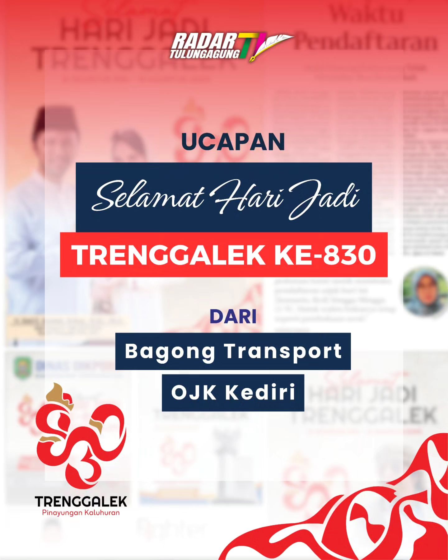 Bagong Transport, yang dikenal dengan Bus Bagong, turut memberikan ucapan selamat kepada Kabupaten Trenggalek. Mereka mengucapkan selamat atas pencapaian yang telah diraih selama 830 tahun ini. Ucapan selamat juga datang dari OJK Kediri, yang berperan penting dalam pengembangan ekonomi daerah.