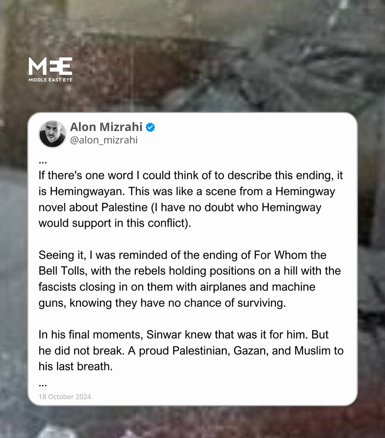 Mizrahi menjelaskan bahwa kematian Sinwar mengingatkannya pada akhir novel "For Whom the Bell Tolls" karya Hemingway. Dalam novel tersebut, terdapat adegan di mana para pemberontak bertahan di atas sebuah bukit sementara pasukan fasis mendekat dengan pesawat dan senapan mesin, menyadari bahwa mereka tidak memiliki peluang untuk selamat.