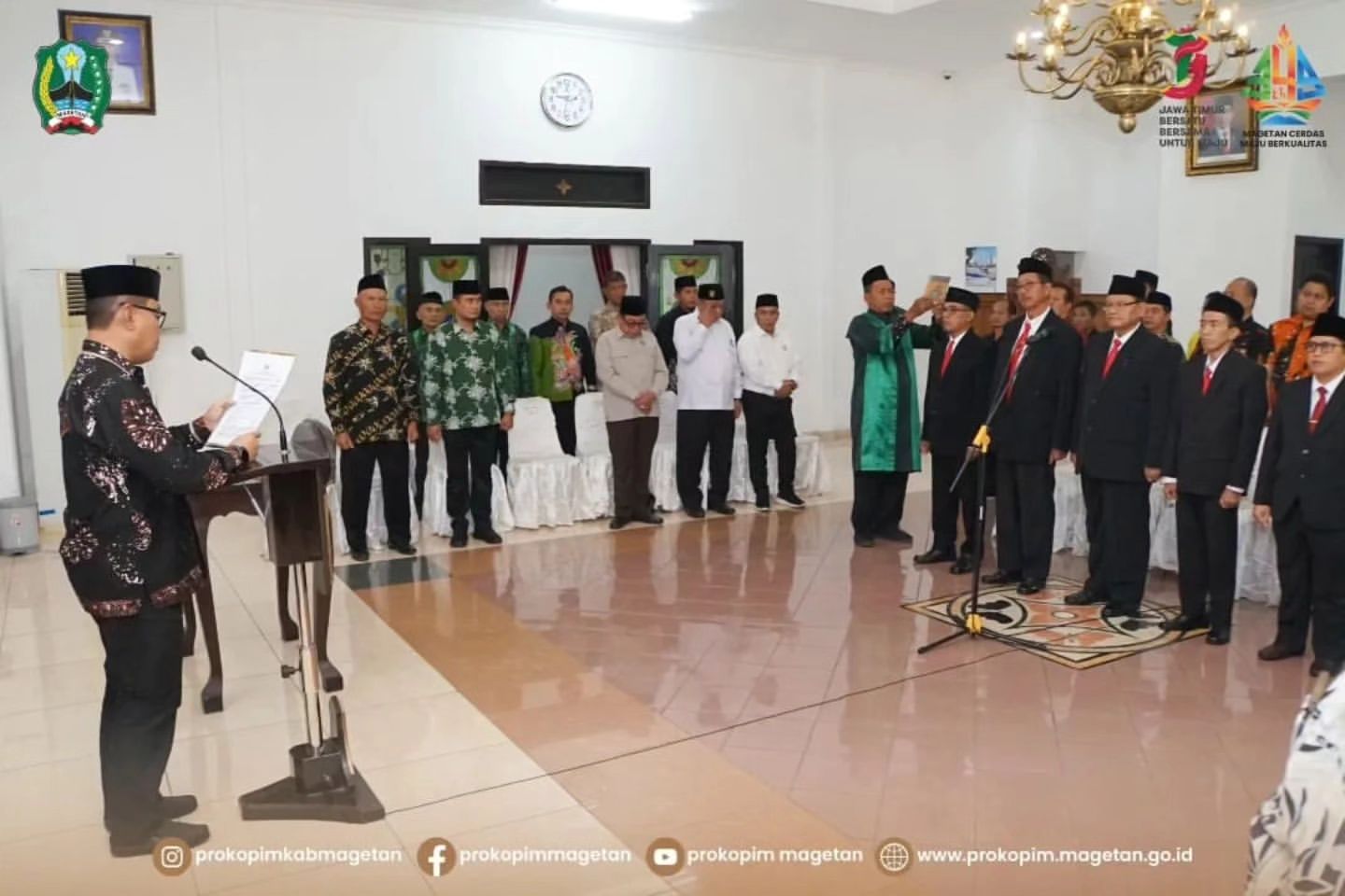 Pimpinan Badan Amil Zakat Nasional (Baznas) Kabupaten Magetan resmi dilantik dan diambil sumpah jabatan oleh Penjabat Bupati Magetan, Nizhamul, S.E., M.M. Acara pelantikan berlangsung di Ruang Jamuan Pendapa Surya Graha Magetan pada hari Sabtu, 19 Oktober 2024.