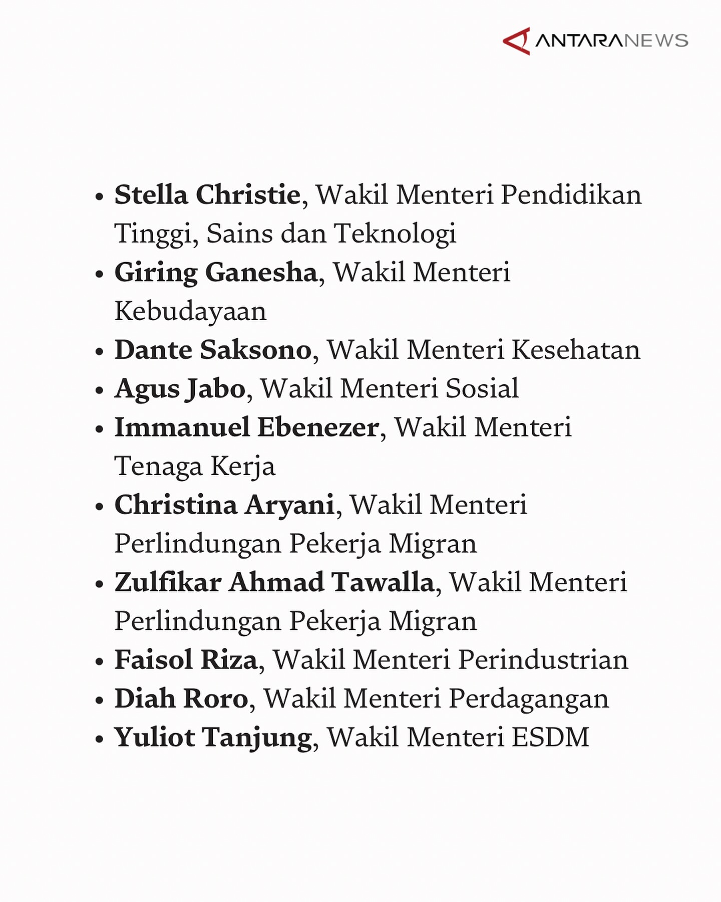 "Kami berharap para wakil menteri ini dapat bekerja dengan maksimal untuk membantu pemerintah dalam menjalankan program-program yang telah ditetapkan," ujar Prabowo.