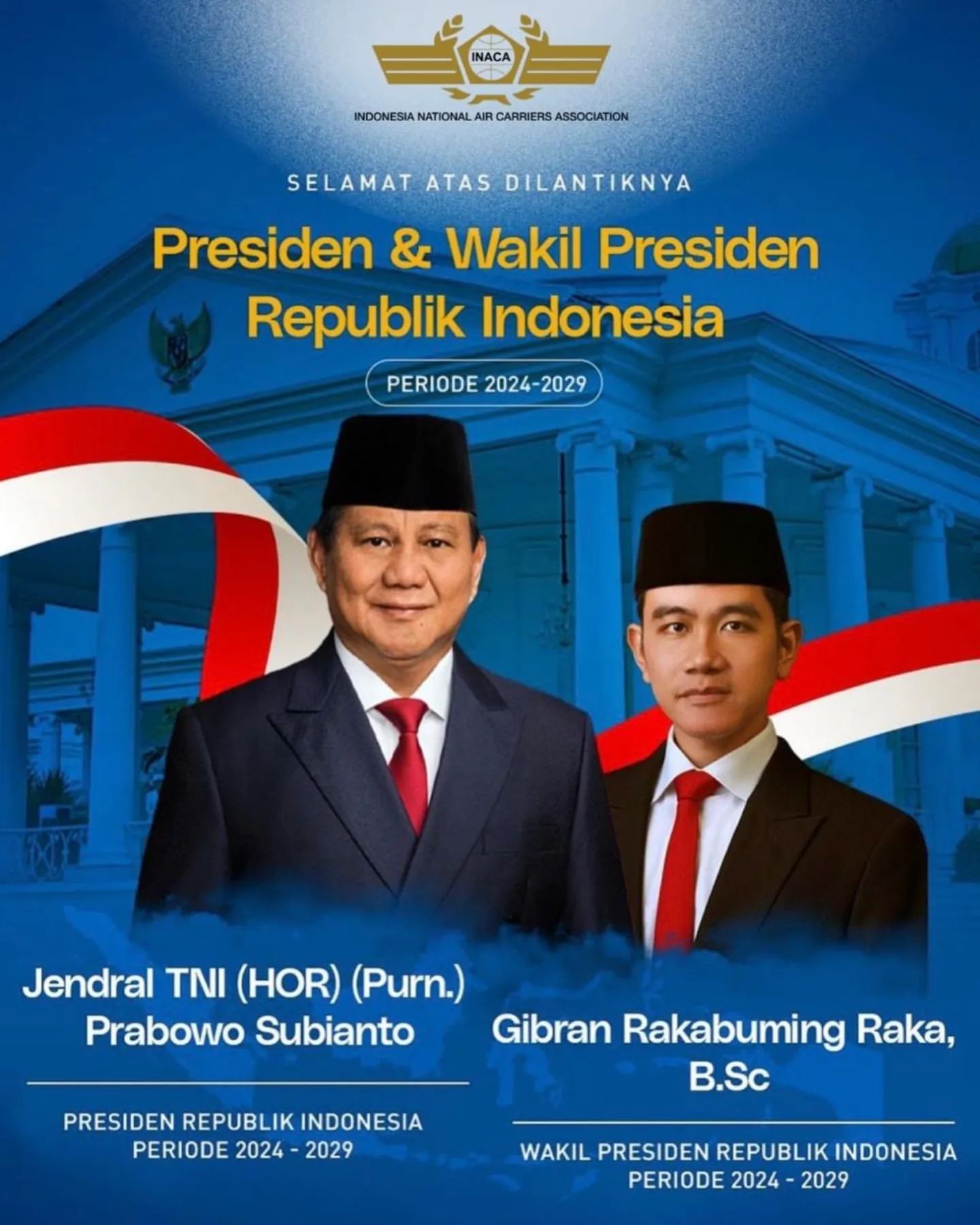 Pada tanggal 20 Oktober 2024, Pengurus dan seluruh anggota INACA (Ikatan Nasional Angkutan Carter) mengucapkan selamat kepada Presiden dan Wakil Presiden Republik Indonesia untuk periode 2024-2029. Ucapan selamat ini menunjukkan dukungan penuh dari INACA terhadap kepemimpinan baru yang akan membawa Indonesia ke arah yang lebih baik.