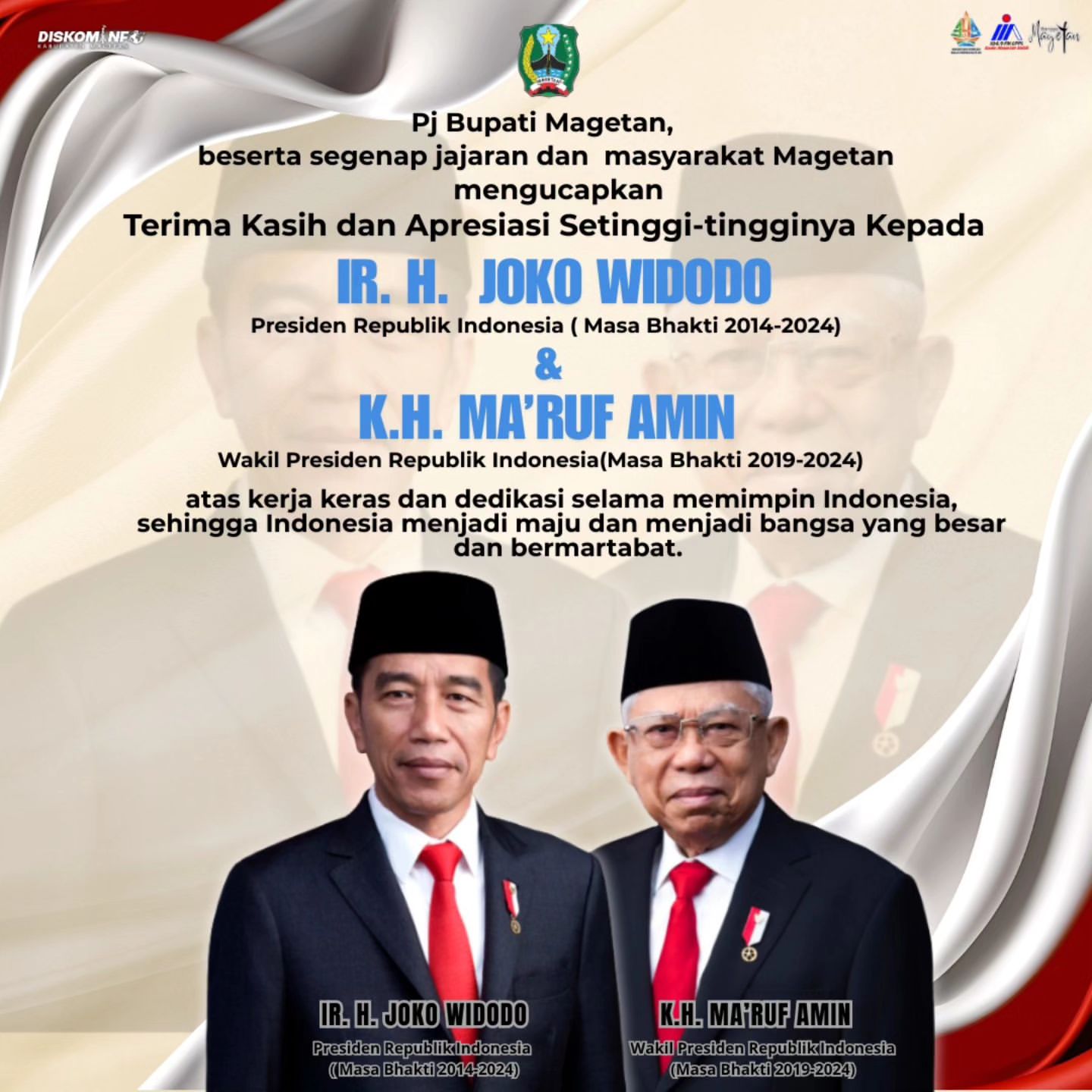 Pj Bupati Magetan, bersama seluruh jajaran pemerintah dan masyarakat Magetan, menyampaikan ucapan terima kasih dan apresiasi yang tinggi kepada Ir. H. Joko Widodo, Presiden Republik Indonesia, serta K.H. Ma’ruf Amin, Wakil Presiden Republik Indonesia. Ucapan ini disampaikan sebagai bentuk penghargaan atas kerja keras dan dedikasi mereka selama masa kepemimpinan.