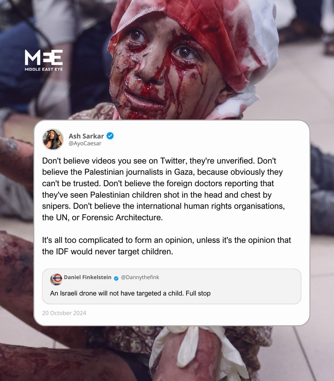 Jurnalis dan editor Ash Sarkar baru-baru ini mengkritik penolakan berbagai bukti, termasuk kesaksian dan rekaman, mengenai serangan yang dilakukan oleh Israel di Gaza. Kritik ini muncul setelah komentar dari kolumnis Times, Daniel Finkelstein, yang meragukan keabsahan rekaman yang menunjukkan seorang anak Palestina yang tewas akibat serangan drone Israel.