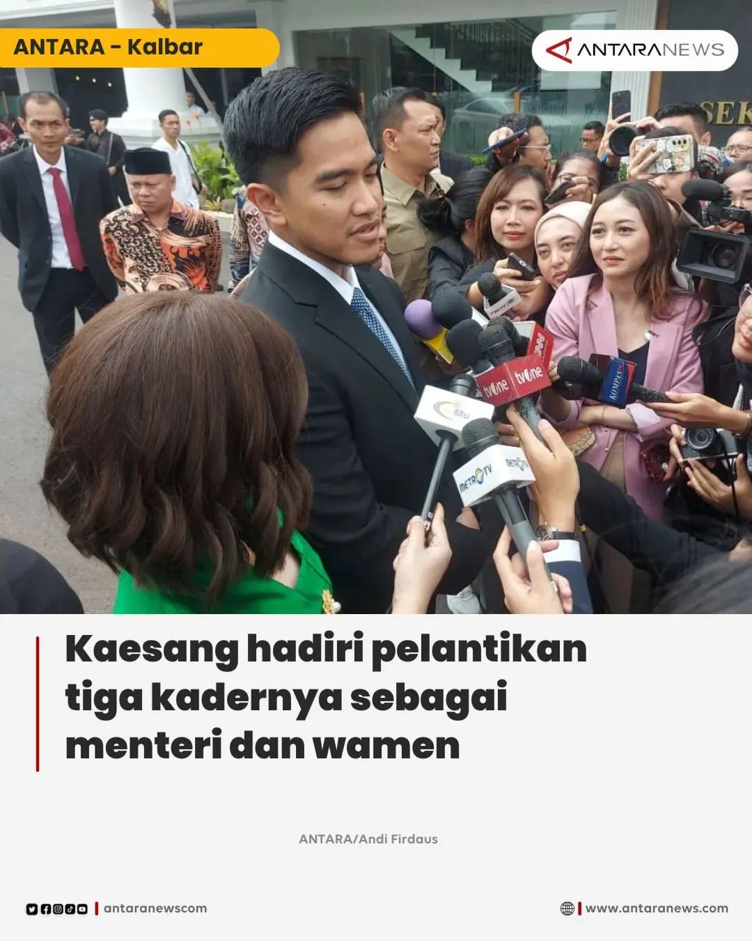 Jakarta, Senin - Ketua Umum Partai Solidaritas Indonesia (PSI) Kaesang Pangarep hadir di Istana Merdeka, Jakarta, untuk menyaksikan pelantikan tiga kader terbaik partainya. Pelantikan ini merupakan bagian dari pembentukan Kabinet Merah Putih untuk periode 2024–2029.