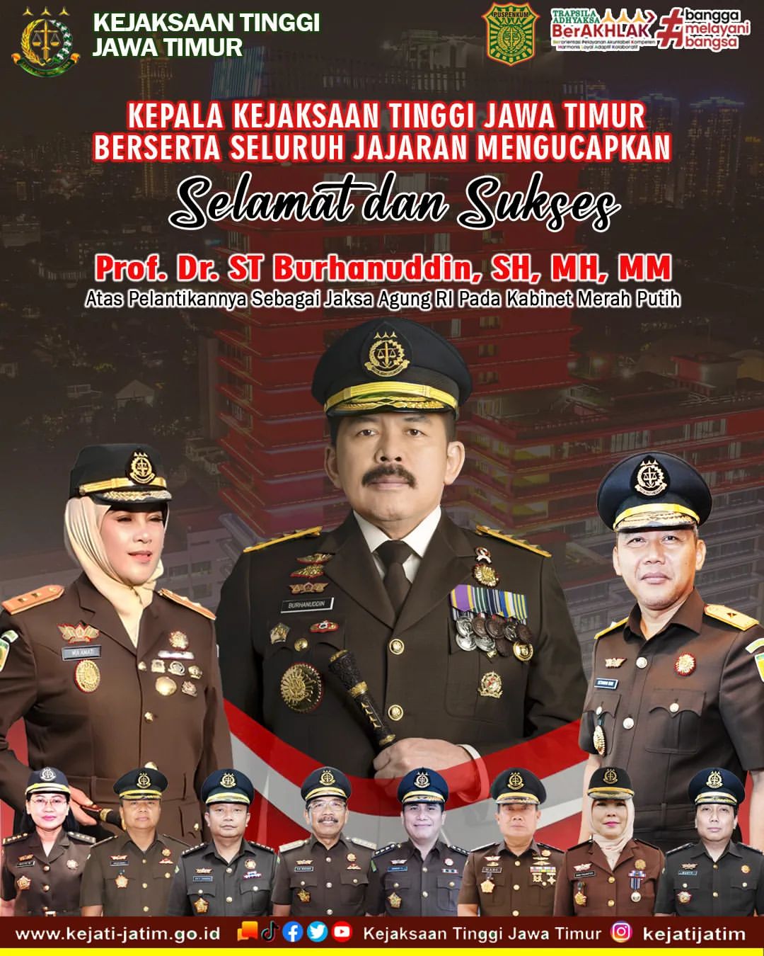 Jawa Timur, 22 Oktober 2024 - Kepala Kejaksaan Tinggi Jawa Timur beserta seluruh jajarannya memberikan ucapan selamat kepada Prof. Dr. ST Burhanuddin, SH, MH, MM. Ucapan ini terkait dengan pelantikannya sebagai Jaksa Agung Republik Indonesia dalam Kabinet Merah Putih.