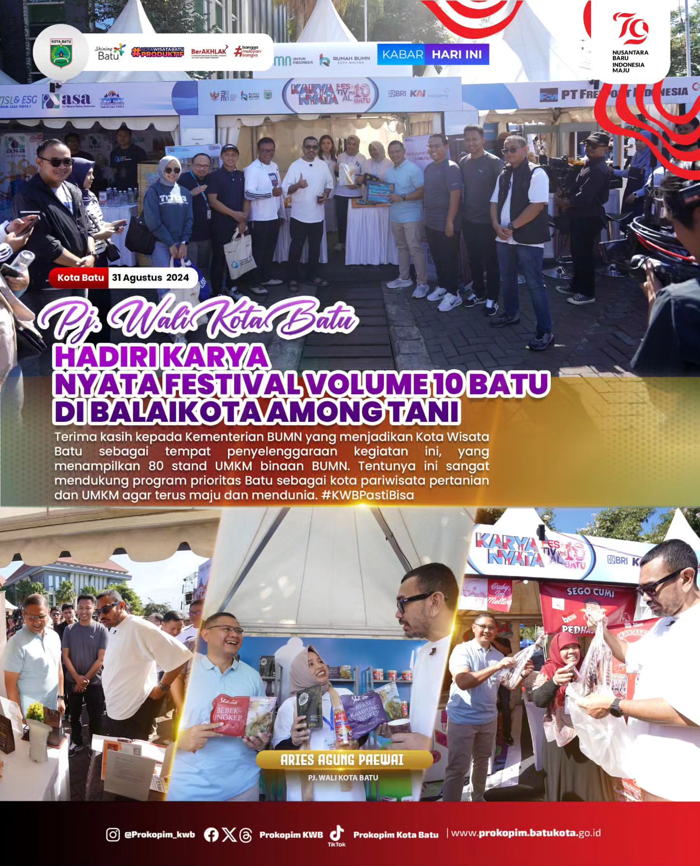Pj Wali Kota Batu, Aries Agung Paewai, menyambut gembira penyelenggaraan Karya Nyata Festival Volume 10 yang berlangsung dari tanggal 31 Agustus hingga 1 September 2024. Festival ini diselenggarakan di Halaman Balaikota Among Tani Kota Batu dengan tujuan untuk memperkuat citra Kota Batu sebagai pusat pariwisata, pertanian, dan usaha mikro, kecil, dan menengah (UMKM).