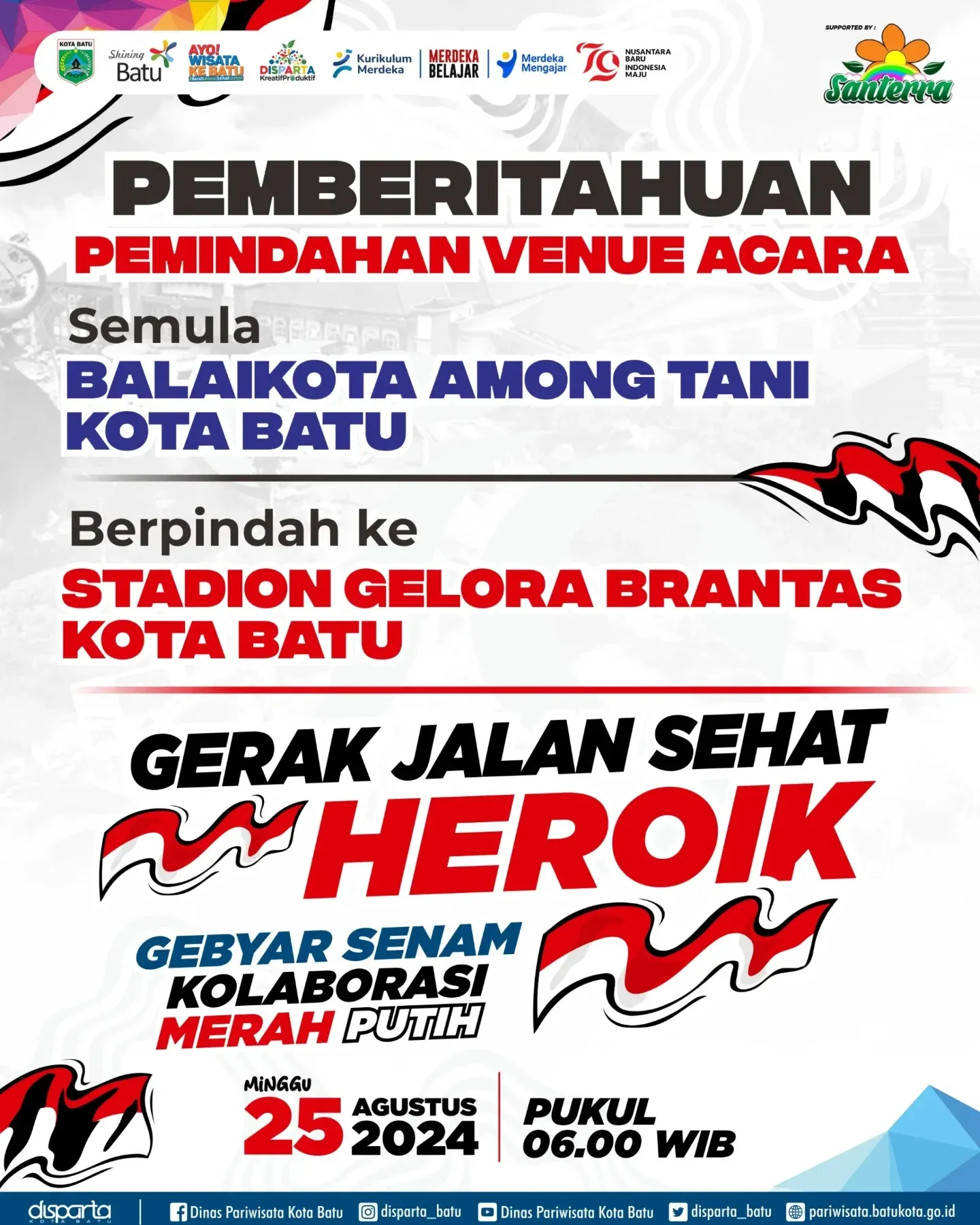 Ayo, jangan lewatkan kesempatan seru ini! Siapkan diri Anda untuk bergabung dalam merayakan semangat kebersamaan dan sehat dengan berpartisipasi di Gerak Jalan Sehat dan Senam Merah Putih. Kita jadikan Kota Batu sebagai tujuan wisata yang menyenangkan!