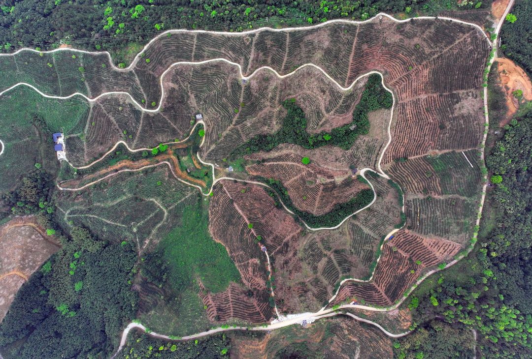 Foto udara yang diambil pada 26 Maret 2024 menunjukkan kebun teh yang indah di Desa Liubao, Kecamatan Cangwu, Kota Wuzhou, di Wilayah Otonomi Zhuang Guangxi, Cina Selatan. Kebun teh ini terkenal dengan Liubao tea, yaitu teh hitam Cina yang memiliki aroma yang kuat dan efek medis yang bermanfaat.
