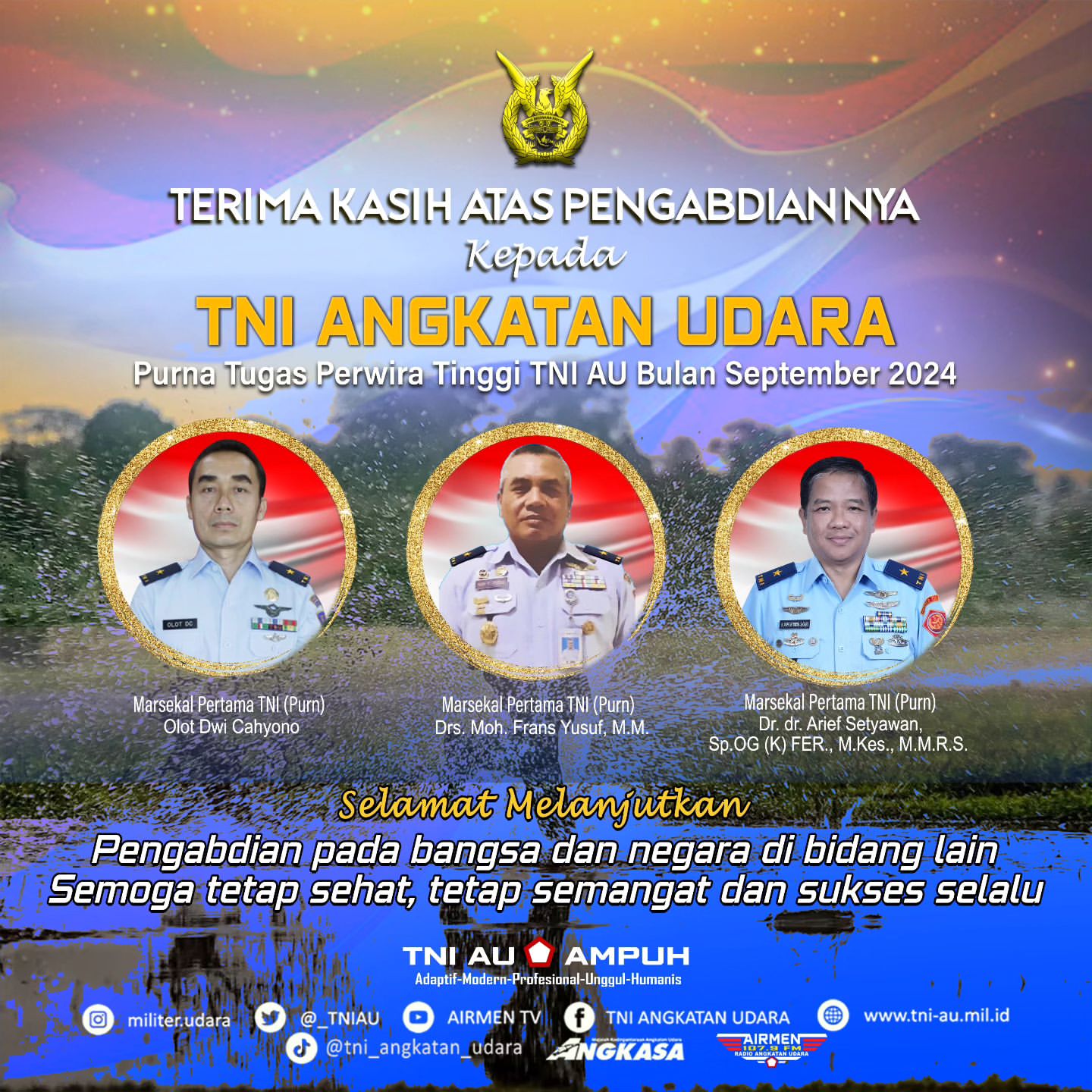 Pada bulan September 2024, TNI Angkatan Udara (AU) mengucapkan terima kasih kepada tiga perwira tinggi yang telah menyelesaikan masa tugas mereka. Ketiga perwira tersebut adalah: